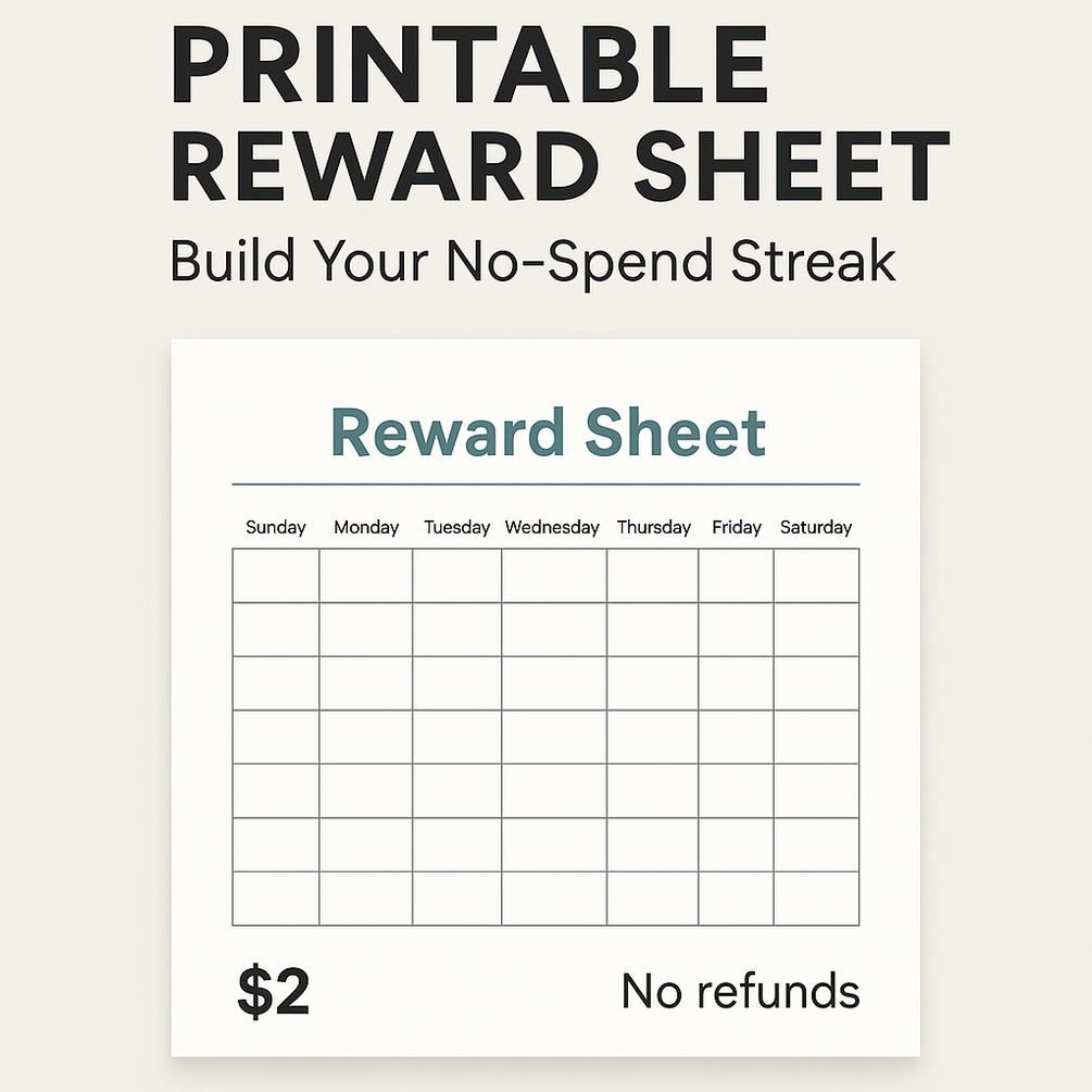 This enhanced, printable reward card helps you log each no-spend victory, capture reflections, and reinforce the habit. Plus, it includes a 3-day streak challenge and a motivational quote to fuel your financial discipline.